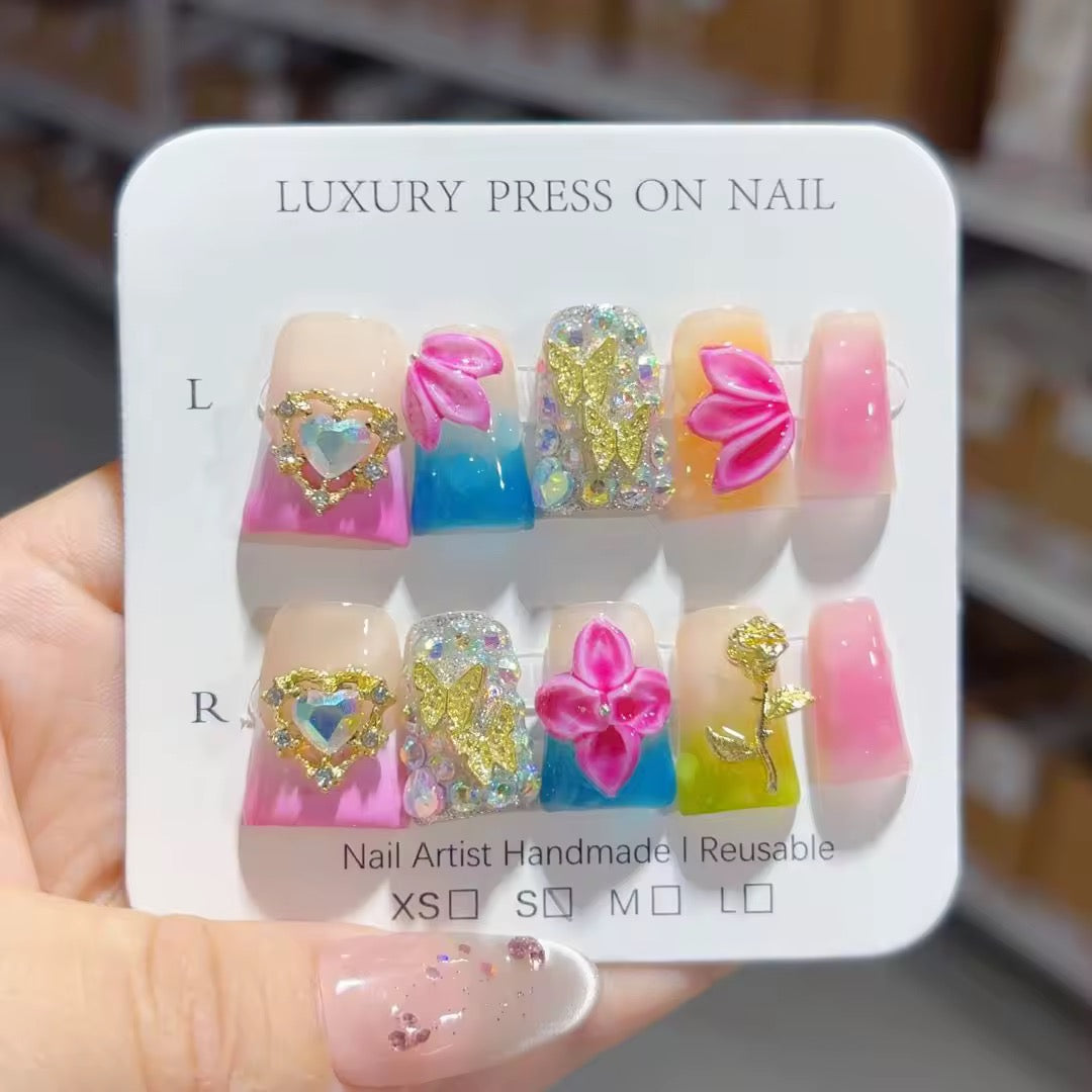 Elevate your spring style with Gold Lotus press-on nails! Handcrafted for durability, these stunning acrylic nails feature enchanting lotus designs and chic gold charms. Perfect for adding a touch of elegance to your look, they embody both beauty and resilience. Transform your nails and embrace your inner goddess today!